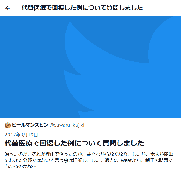 archive.today/RQV4o ああ、これナカイサヤカさん@sayakatake なんですね。はじめまして。 https://t.co/b1TSW8FQXK 上のツイートは、橋迫瑞穂氏と翻訳者であるナカイサヤカ氏がツイッター上で、初めて遭逢した出来事のように見えますが、実は違います。 拙ブログ管理人が確認した限りでは、この二人の初めての邂逅は、 村中璃子氏の「(※1)リベラルだってワクチンを打っていい」という note.com に掲載された記事を巡ってのものでした。 政治的価値観の違いとワクチンに対する価値観との相関を論じた村中璃子氏の記事に対し、橋迫瑞穂氏とナカイサヤカ氏との間での話題は、(※2・※3)ニューエイジからナチズム、そして日本と欧米の「自然」信仰、自然出産にまで及びました。 その後 、再び、橋迫瑞穂氏とナカイサヤカ氏との間で(※4)ツイートが交わされます。 それは、北村紗衣氏の「(※5)無神論者になった私が、フェミニストとして居心地が悪い理由」と題した wezzy の記事を巡るものでした。 古い信仰に残る女性抑圧的な宗教とフェミニズムとの相性の悪さを論じたうえで、では、無神論ではどうかというと、近年の無神論者には、ニセ科学や「スピ系」批判等のジャッジメントは男性固有のものといった、男性を理性の側に、女性を感情や自然の側に置く性差別的で男性中心的な文化があり、居心地の悪さを感じるといった内容の記事に対して、長引いたベトナム戦争や、反権威つまり伝統的な家父長制に対するアンチテーゼとして勃興した 1960年代の(※6)ニューエイジ運動を歴史的な位置付けから捉えなおそうと試みるナカイサヤカ氏が印象的です。 見てきたように、ツイッター上で両者の間には既に交流があったにもかかわらず、何故、橋迫瑞穂氏はナカイサヤカ氏に対して、この時『はじめまして』と挨拶したのでしょうか? 本稿では、不気味とも思える、この奇妙な『はじめまして』を掘り下げていきます。 ナカイサヤカ氏代表の「えるかふぇ」にて、児童精神科医であるながし氏を講師に迎えて心因性疼痛に関するイベントが催されました。心因性疼痛に関しては、拙ブログでも幾度か取り上げていますので、ご参照下さい。 上記「えるかふぇ」のブログでは、イベントの告知だけなので、どのような内容だったのかまでは具体的にわかりませんが、ビールマンスピン氏が作成したツイッターのまとめを見ることで、多少はうかがい知ることができると思います。 先日のえるかふぇで、なんでカイロでHPVワクチン副反応が良くなるのかを簡単に解説したけど、まぁなんでも良いんだよ良くなるポイントはそこにはないから。鍼灸でもなんでもポイントにはまれば良くなる可能性がある。 ビールマンスピン氏が作成したまとめの冒頭にあるツイートです。 このツイートから推測すると、えるかふぇのイベントでは、HPVワクチンの副反応とされているものの一部には心因性疼痛の可能性があり、そうした心因性の身体症状がカイロプラクティック等の代替医療でも改善する事があり得るという話が児童精神科医の立場からあったのだろうと推測できます。 ただ、ビールマンスピン氏とながし氏との会話が嚙み合っていないのは、ながし氏が特定の人物や方法によらず、心因性の身体症状が代替医療でも改善し得るという説明をしようとしているのに対し、ビールマンスピン氏は質問という形式をとってはいるものの、疑問を解消する為というよりも特定の人物、つまり、神戸の林こと林碩虎氏に対しての何らかの言質を取るために、ながし氏を誘導しようとしている為だろうと思います。 ビールマンスピン氏が主張したかった事とは、つまり、このまとめの最後のこのツイートに表れているのではないでしょうか。 「治らなければ、治す気のない親子」というレッテルの問題点を、神戸の林こと林碩虎氏は、例え死んで生まれ変わったとしても理解する能力を持ち合わせてなどいないでしょうし、また、そもそも理解しようとする気すらおきないことでしょう。 そうした神戸の林こと林碩虎氏のある種の特性が、批判の矛先を林氏だけに留めることをさせずに、第三者にまで向かわせることになるのではないでしょうか。 悪質な洗脳でなければ良いのですか? 上記のアーティクルにて、私は 通りすがり(@das_ist_nicht__) について、このように評しました。 通りすがり(@das_ist_nicht__)のプロフィール欄によると、免疫抑制剤を必要とする障がい児がいるようです。その為に、特に感染症や予防接種については神経質になっているのでしょう。 その一方で、早朝から深夜にまでわたり、毎日毎日リツイートを含め凡そ 300件ほども送信されるツイートからは、SNS で社会をわかった気になり、世界を見るパースが思いっきり狂っている様子がうかがわれます。 言い換えれば、自分をあたかも事情通であると錯覚し、盛んにデマを含んだツイートを送信し、惑わされた人々が右往左往する様子を見ては下品に喜んでいるような傾向があります。 
