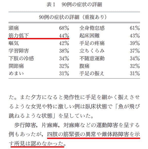 90例の症状の詳細(重複あり):筋力低下44%、四肢の筋緊張の異常や錐体外路障害を示す所見は認めなかった。