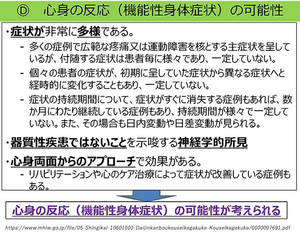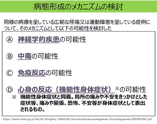 よく誤解されていますが「心因性=詐病あるいは気の病」ではなく、器質的な原因が見つからなくても激しい疼痛や痙攣様の不随意運動をきたす患者さんはいます。彼らは本当に苦しんでいますが、証拠がないのにワクチンが原因であると思い込むことで適切な治療から遠ざかることになれば残念なことです。