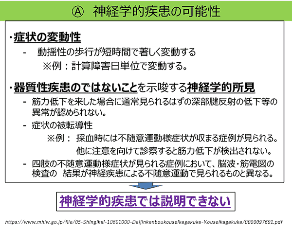 この演目では、4つの仮説のうち、神経学的疾患・中毒・免疫反応の3つの可能性を否定して、『心身の反応(機能性身体症状)の可能性が考えられる』としています。