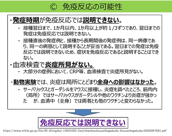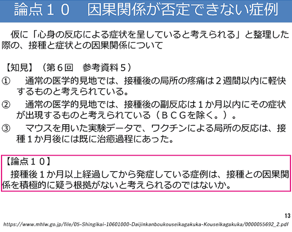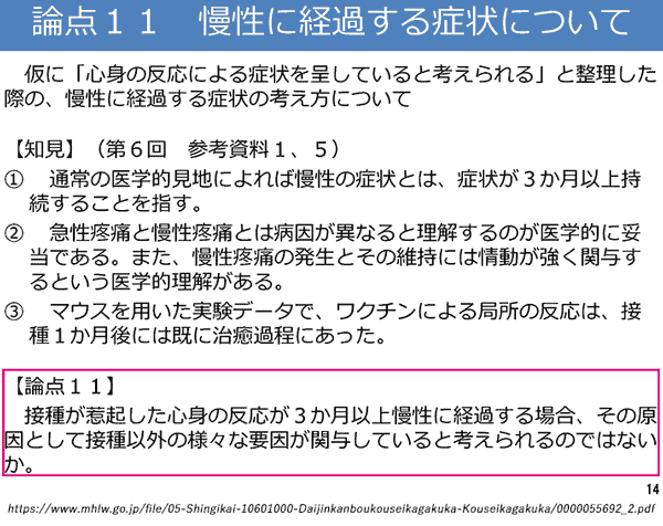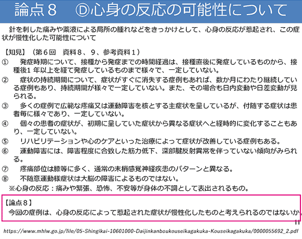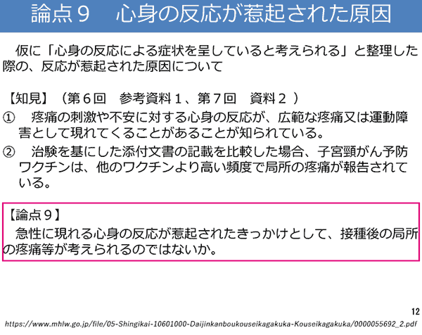 とは、論点整理(P.13)にある、「急性に現れる心身の反応が惹起されたきっかけとして、接種後の局所の疼痛等が考えられるのではないか。」とも符合します。