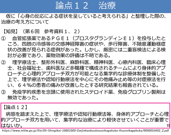 病態を踏まえた上で、理学療法や認知行動療法等、身体的アプローチと心理的アプローチ双方を用いて、集学的な治療により軽快させていくことが重要ではないか。とされている点を、心に留め置いていてください。