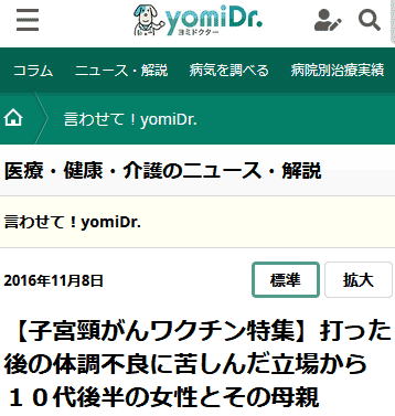 - ^ (※1) 【子宮頸がんワクチン特集】打った後の体調不良に苦しんだ立場から 10代後半の女性とその母親 | ヨミドクター(読売新聞)
